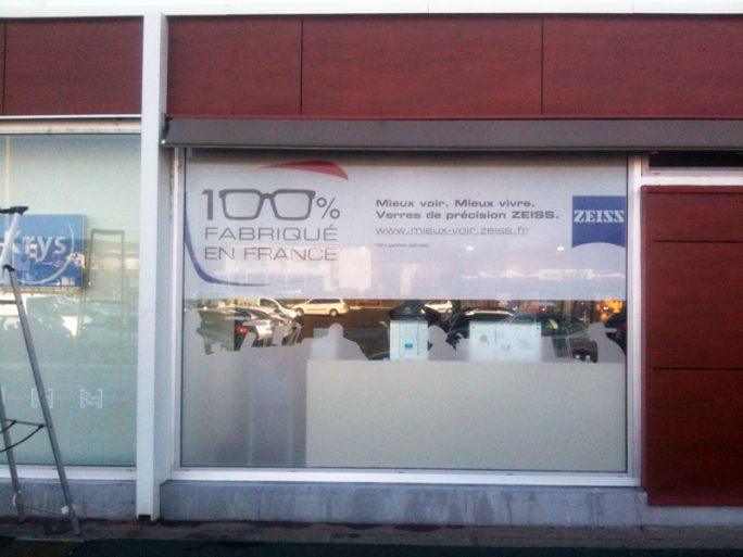 Impression vinyle microperforé et lettrage découpé.